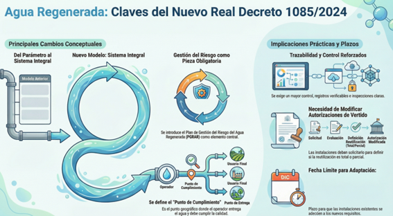 El RD 1085/2024 introduce la gestión del riesgo como pieza obligatoria del sistema, a través del Plan de Gestión del Riesgo del Agua Regenerada (PGRAR), y lo vincula a responsabilidades, requisitos posteriores al punto de cumplimiento (almacenamiento, distribución y uso) y respuesta ante desviaciones. Para un sistema descentralizado, el PGRAR no puede ser un “anexo formal", es el documento que justifica por qué el paquete de tratamiento, operación y control es suficiente para el uso previsto, y cómo se mantiene esa seguridad en el tiempo. El reglamento refuerza (i) el control del cumplimiento, (ii) la trazabilidad documental y (iii) la lógica de “puesta en servicio” condicionada a verificación cuando el condicionado lo requiera (y, en ciertos casos, validaciones). Además, integra las autorizaciones de producción y suministro en sistemas de información/censos e impone un marco claro de inspección, vigilancia y actuación ante incumplimientos