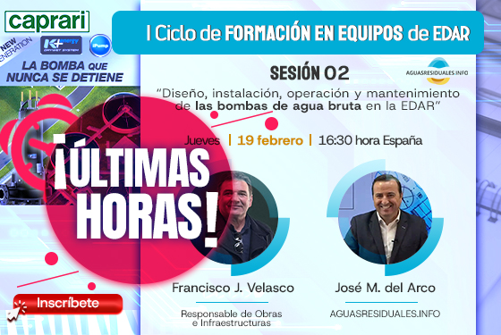 Hoy a las 16:30 h de España, celebramos la Sesión 02 de nuestro Ciclo de Formación online de Equipos de EDAR, bajo el título "Diseño, instalación, operación y mantenimiento de las bombas de agua bruta en la EDAR" donde contaremos con Francisco José Velasco López - Responsable de obras e infraestructuras y con Fabián Santisteban Castro - Director Comercial, ambos de Bombas Caprari, más de 800 profesionales ya se han inscrito, todavía puedes hacerlo aquí...