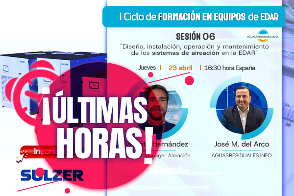 Hoy a las 16:30 horas de España continúa nuestro “I Ciclo de Formación online en Equipos de EDAR” con la Sesión 06, impartida por Vicente Hernández, Product Manager de Aireación de SULZER, bajo el título “Diseño, instalación, operación y mantenimiento de los sistemas de aireación en la EDAR”, centrada en los equipos de aireación instalados en las depuradoras de aguas residuales urbanas e industriales. Más de 800 profesionales ya se han inscrito en esta sesión, todavía puedes hacerlo aquí...