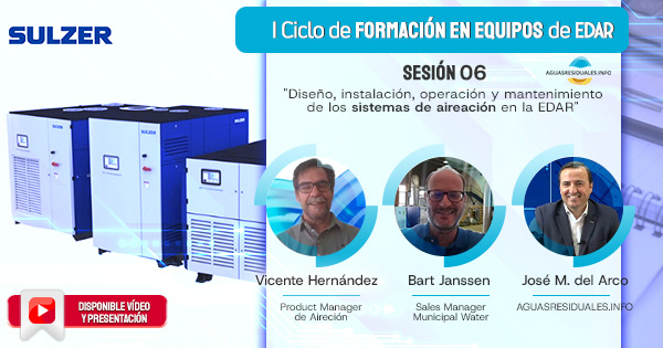 Ya está disponible la sexta sesión del “I Ciclo de Formación online de Equipos de EDAR”, celebrada el pasado jueves 23 de abril a las 16:30 horas (España), con una destacada participación de 848 profesionales de España, Portugal y América Latina, reflejando el gran interés del sector. La jornada fue impartida por Vicente Hernández, Product Manager de Aireación de SULZER, e intervino en la ronda de preguntas Bart Janssen, Sales Manager Municipal Water de SULZER. Durante la sesión se abordaron los aspectos clave del diseño, instalación, operación y mantenimiento de los sistemas de aireación en EDAR urbanas e industriales, destacando su impacto en la eficiencia energética y el rendimiento del proceso biológico, además de presentarse las soluciones tecnológicas de SULZER orientadas a la optimización de procesos y la sostenibilidad.
