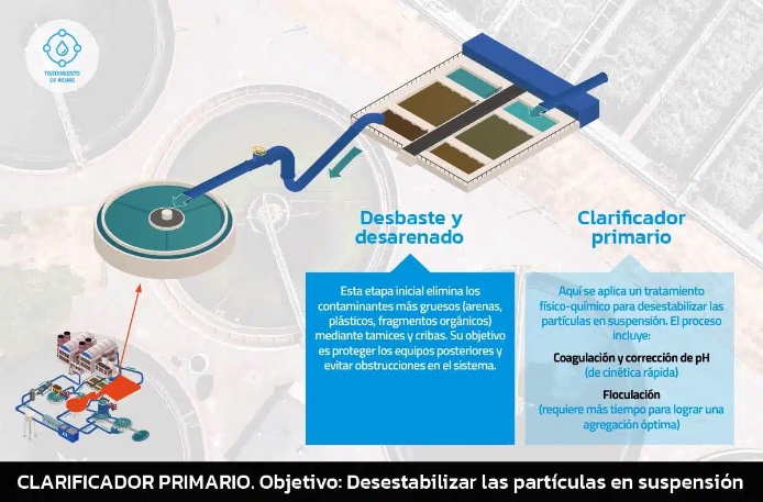 Aquí se aplica un tratamiento físico-químico para desestabilizar las partículas en suspensión. El proceso incluye: