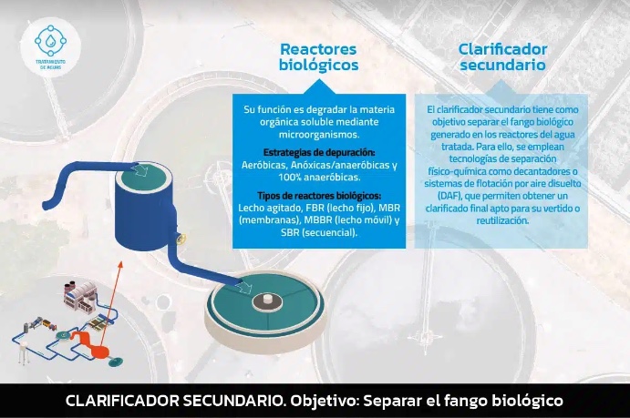 El clarificador secundario tiene como objetivo separar el fango biológico generado en los reactores del agua tratada. Para ello, se emplean tecnologías de separación físico-química como decantadores o sistemas de flotación por aire disuelto (DAF), que permiten obtener un clarificado final apto para su vertido o reutilización.