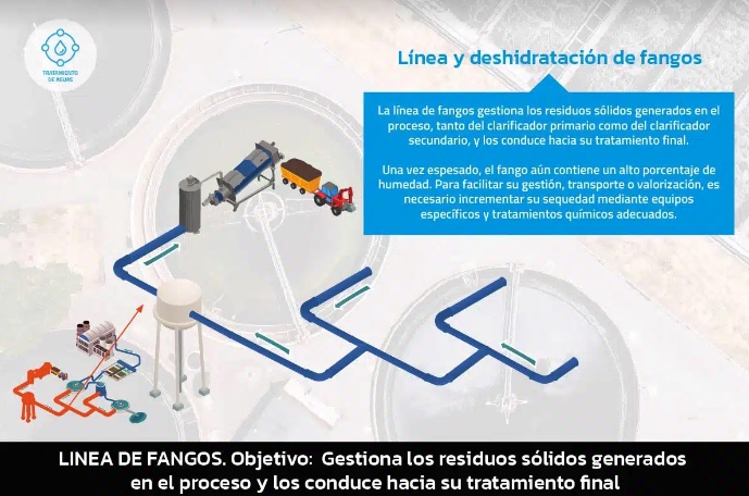 Esta línea gestiona los residuos sólidos generados en el proceso, tanto del clarificador primario como del clarificador secundario, y los conduce hacia su tratamiento final. Veamos sus principales componentes: