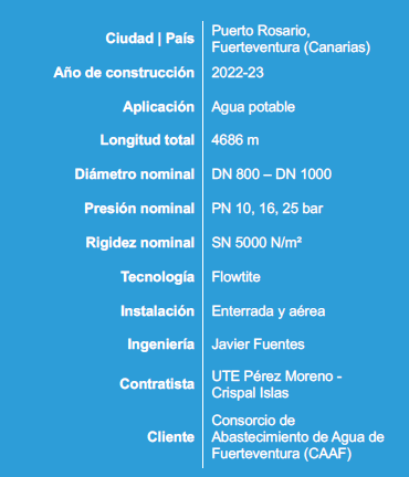 Finalizada en febrero de 2024, la nueva conducción de PRFV de Fuerteventura garantiza un transporte fiable del agua, cubre plenamente la demanda actual y aporta la capacidad necesaria para el crecimiento futuro, mejorando de forma significativa la resiliencia y la seguridad del suministro de agua para los habitantes de la isla.