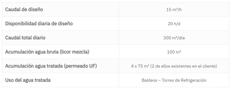 Para el diseño de esta solución se ha tomado en consideración una configuración del sistema de ultrafiltración de alimentación y purga, de forma que parte del concentrado se recircula en un circuito cerrado y una parte regresa directamente a la etapa de tratamiento anterior. Esto lleva a un diseño con una bomba de alimentación, y una bomba de recirculación. Esta configuración está enfocada a un menor consumo de energía (OPEX).