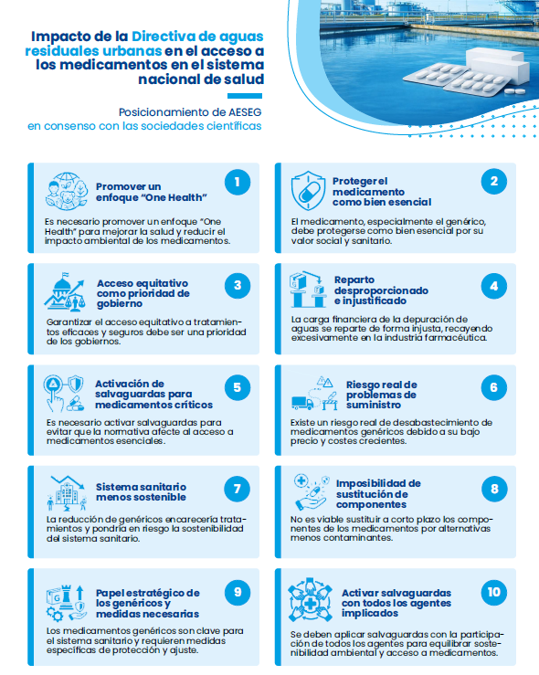 La Asociación Española de Medicamentos Genéricos (AESEG) ha presentado hoy un posicionamiento sobre el impacto que la Directiva sobre el tratamiento de aguas residuales urbanas (TARU) puede tener en el acceso de los pacientes a medicamentos esenciales y en la sostenibilidad del Sistema Nacional de Salud (SNS).