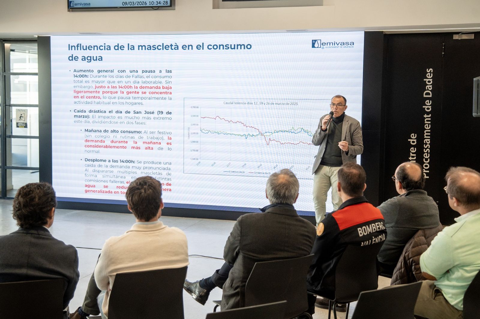 Entre los datos más curiosos respecto al consumo en Fallas que se han contado hoy, cabe destacar que es justo “a las 14.00 horas cuando la demanda de agua baja porque la gente se concentra en el centro de la ciudad lo que pausa temporalmente la actividad habitual en los hogares. Pasa algo similar a lo que sucedía durante la pandemia y los aplausos a los sanitarios que también quedaban perfectamente registrados” ha asegurado Macián.