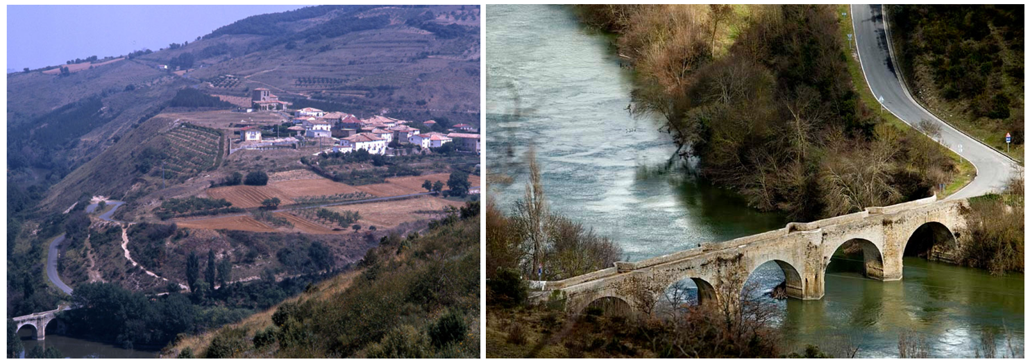 La imagen muestra el enclave de Belascoain, situándose a la derecha el núcleo urbano y, a la izquierda, uno de sus accesos principales: el histórico puente medieval que cruza el río Arga, elemento emblemático que forma parte del paisaje y la identidad del municipio.