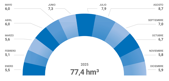 Los 70 municipios consorciados han consumido un 67 % del agua distribuida, mientras que el 33 % restante se ha repartido entre las 27 industrias que forman parte del CAT, un porcentaje idéntico al de 2024. Por meses, y como es habitual, agosto ha sido el periodo de mayor consumo con un balance mensual de 8,7 hm³, mientras que durante enero se han suministrado 5,3 hm³, alcanzando así el mínimo anual.