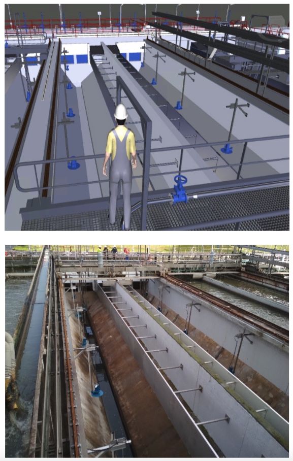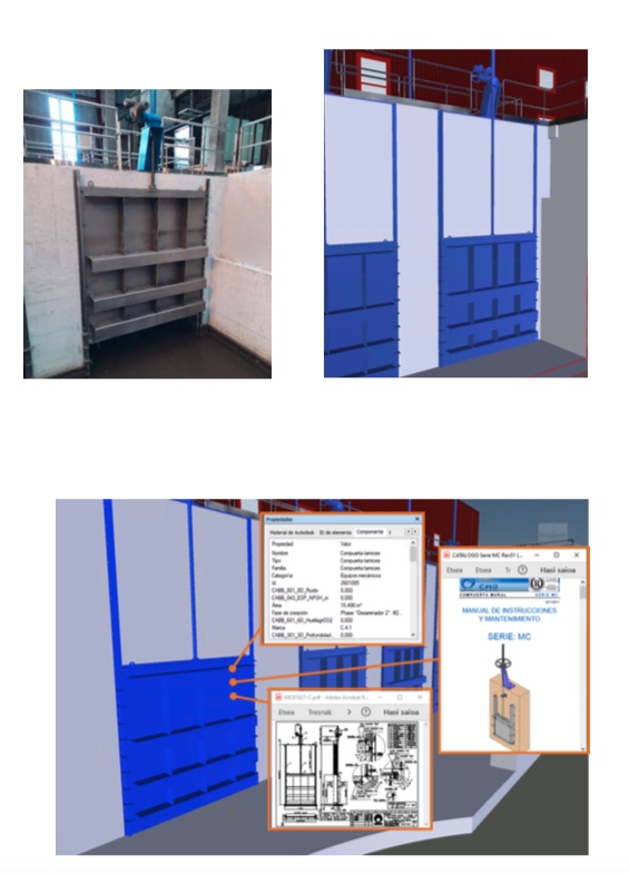 La dinámica de trabajo ha incluido dos de las dimensiones de la metodología BIM: la elaboración del modelo gráfico tridimensional (3ª dimensión) a partir de la nube de puntos obtenida de la instalación inicial, y su enriquecimiento con la documentación de cada uno de los equipos instalados (7ª dimensión). De esta manera, es posible explorar el gemelo digital del proceso del pre y desarenado y, además, acceder a las fichas de especificaciones técnicas, manuales de instalación y mantenimiento y otro tipo de información desde el propio modelo 3D.