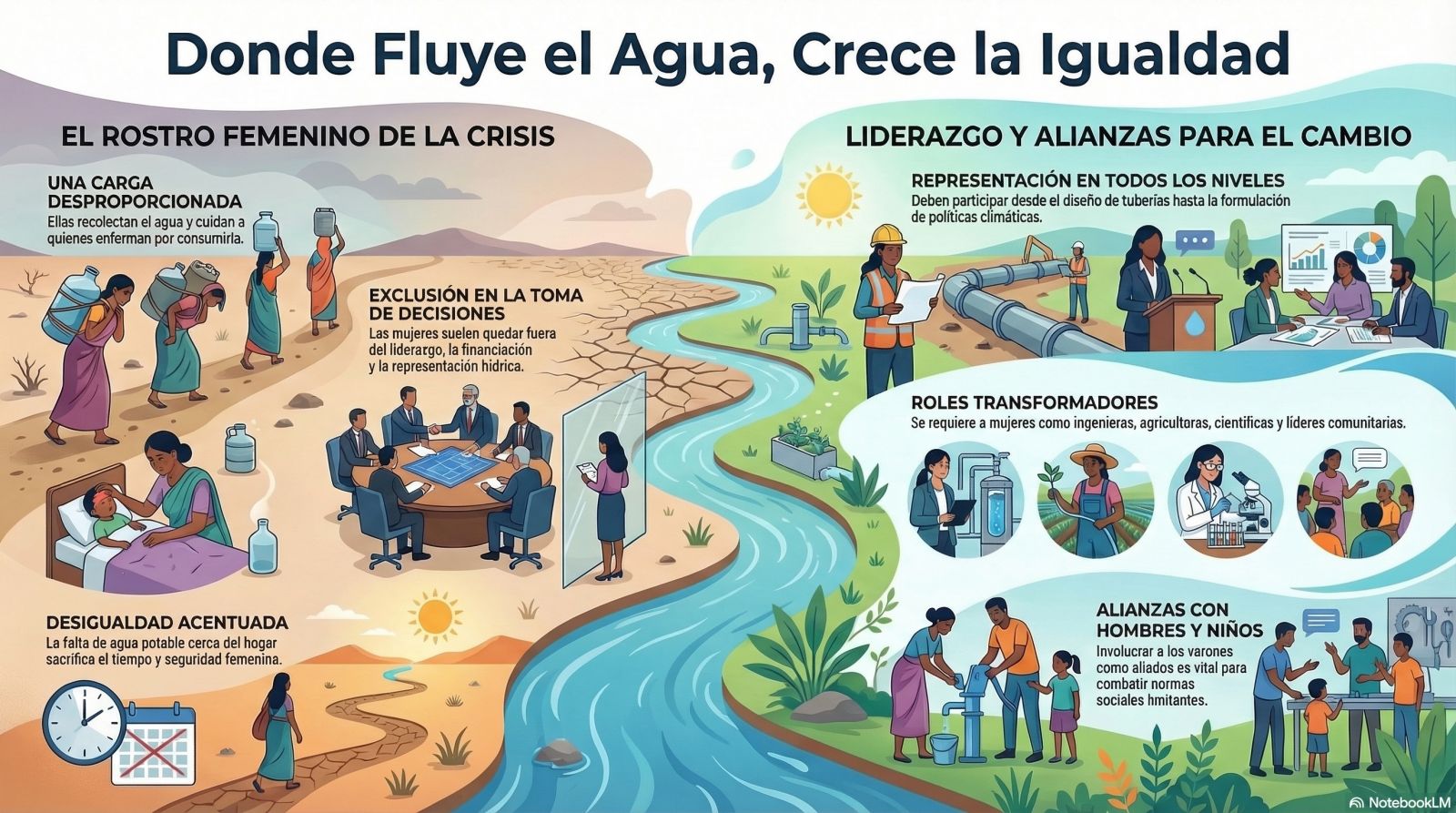 Desde ONU-Agua se insta a gobiernos, organizaciones y comunidades a invertir en el liderazgo femenino para convertir el agua en un motor de resiliencia frente al cambio climático.