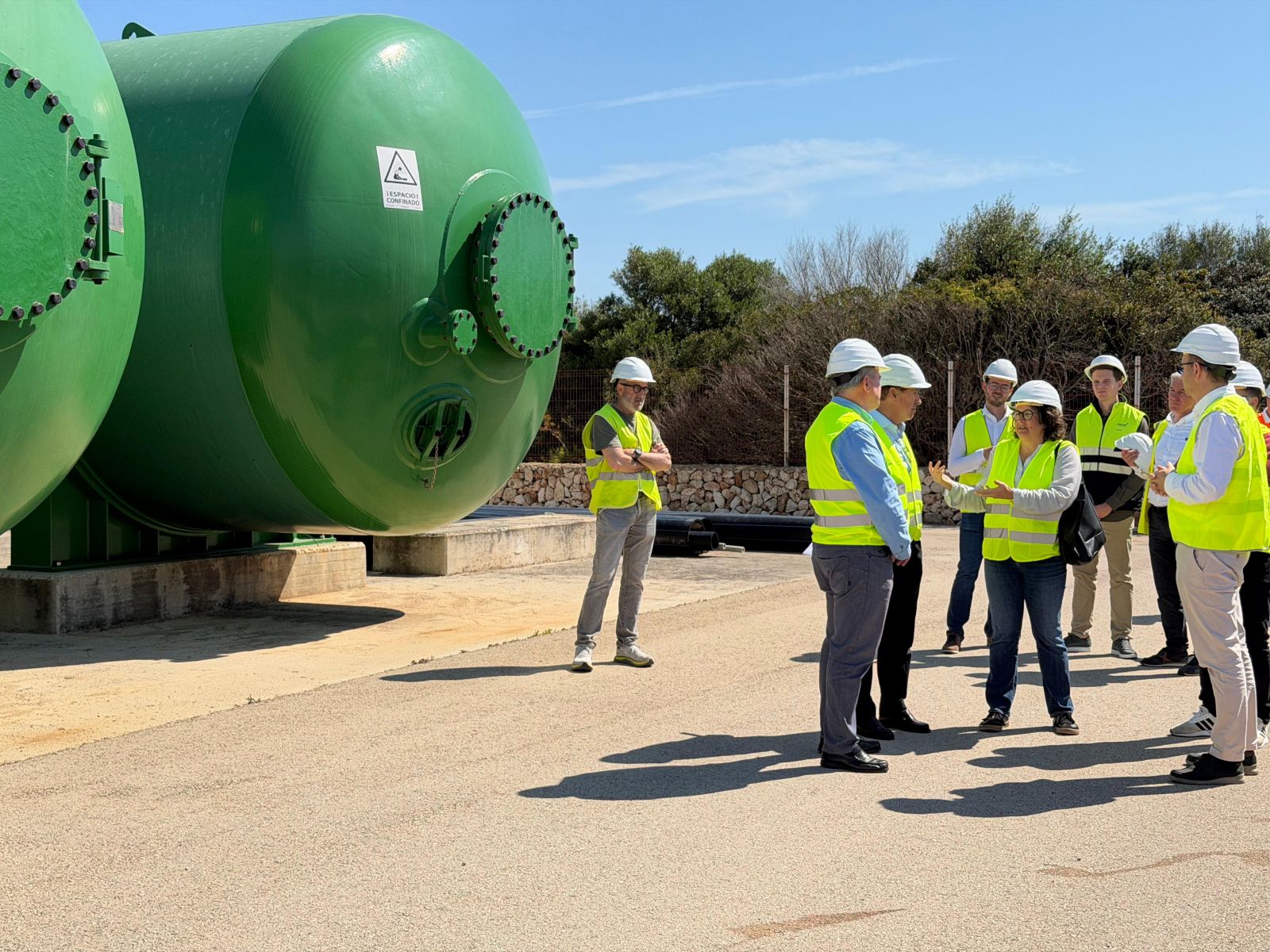 El conseller del Mar y del Ciclo del Agua, Juan Manuel Lafuente, acompañado por el director general de Recursos Hídricos, Joan Calafat, el gerente de ABAQUA, Emeterio Moles, la alcaldesa de Ciutadella, María Jesús Bagur, y el concejal de Deportes, Miquel Ametller, ha visitado la desaladora de Ciutadella para conocer las mejoras ejecutadas en esta infraestructura estratégica.