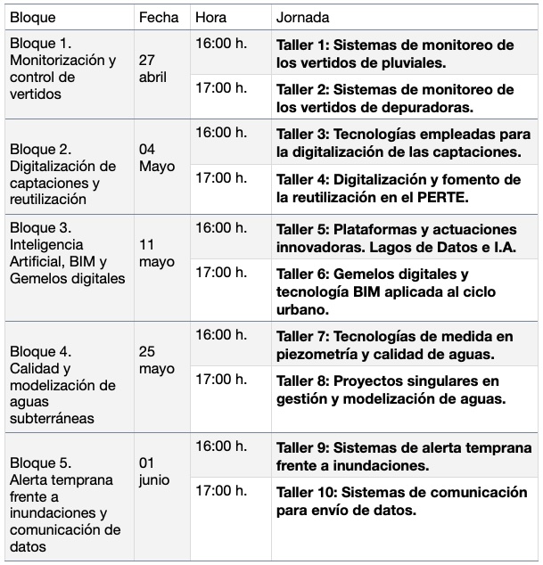El ciclo se inicia el próximo lunes 27 de abril a las 16:00 h de España con el “Taller 1: Sistemas de monitoreo de los vertidos de pluviales” con la participación de Canal de Isabel II y Aguas de Burgos.