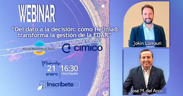 El miércoles 21 de enero a las 16:30 horas de España, llevaremos a cabo un nuevo Webinar técnico en esta ocasión bajo el título "Del dato a la decisión: cómo Helinia® transforma la gestión de la EDAR" impartida por la empresa CIMICO.