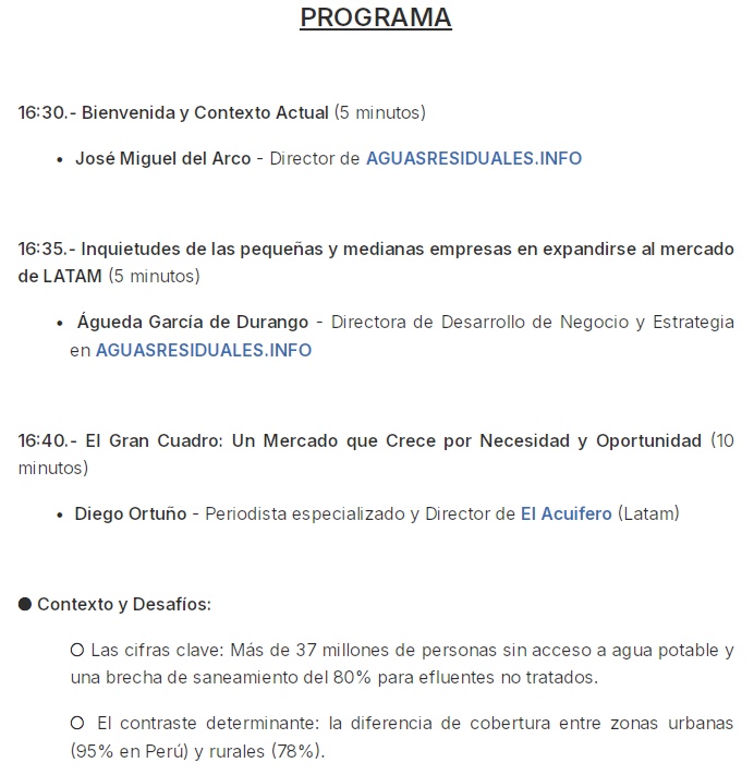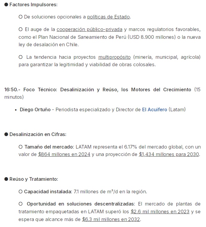 En este Webinar, Diego Ortuño, periodista con experiencia en el sector, desglosará las claves de este mercado. Analizaremos en cifras el potencial de la desalinización y el reúso, exploraremos los megaproyectos que están definiendo el futuro hídrico de países como Chile, Perú, México, Brasil y Argentina, y ofreceremos una hoja de ruta con recomendaciones prácticas para la penetración exitosa en este vibrante mercado.