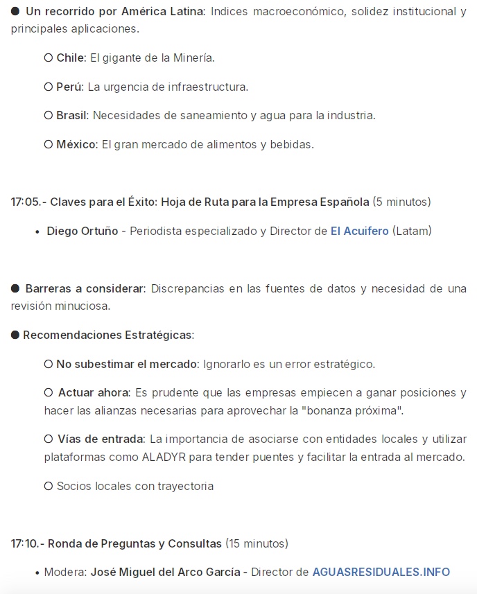 El lunes 20 de octubre a las 16:30 horas de España, llevaremos a cabo un nuevo Webinar para conocer "Oportunidades en el Mercado del Agua de América Latina para Empresas Españolas" donde contaremos con Diego Ortuño, periodista con gran experiencia en el mercado de LATAM.