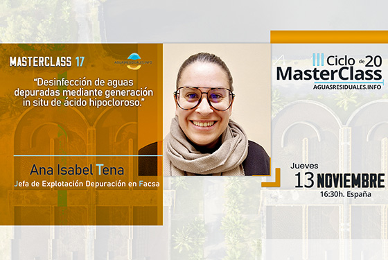 Tras el enorme éxito de la primera parte de nuestro III Ciclo de MasterClass, donde han participado más de 3.500 profesionales únicos, continuamos con la MasterClass número 17, que se llevará a cabo el jueves 13 de noviembre a las 16:30 horas de Madrid (España) y donde hablaremos de "Desinfección de aguas depuradas mediante generación in situ de ácido hipocloroso" con Ana Isabel Tena - Jefa de Explotación de Depuradoras de FACSA.