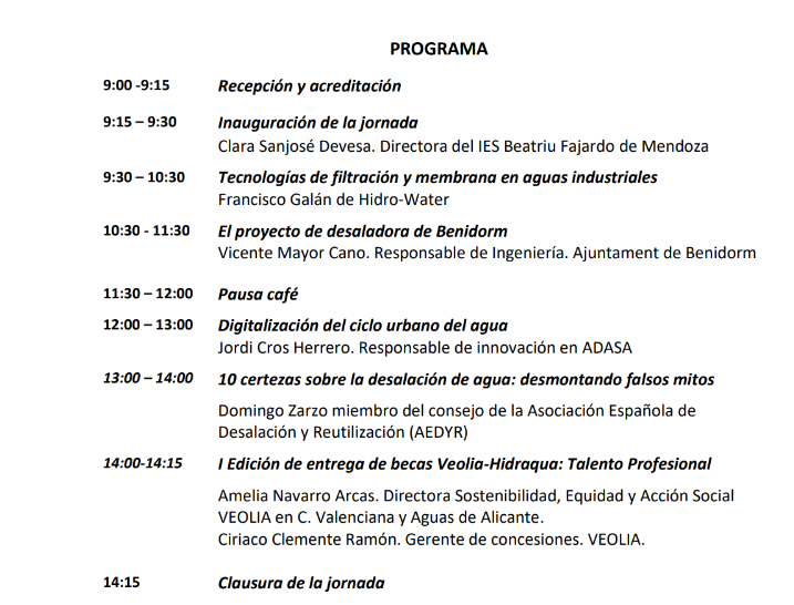 El próximo 25 de febrero se celebrará la cuarta edición de la Jornada del Agua en la  Formación Profesional. Organizada por el IES Beatriu Fajardo de Mendoza de Benidorm único centro de la provincia de Alicante que oferta los ciclos de grado  medio y superior asociados al ciclo urbano del agua.