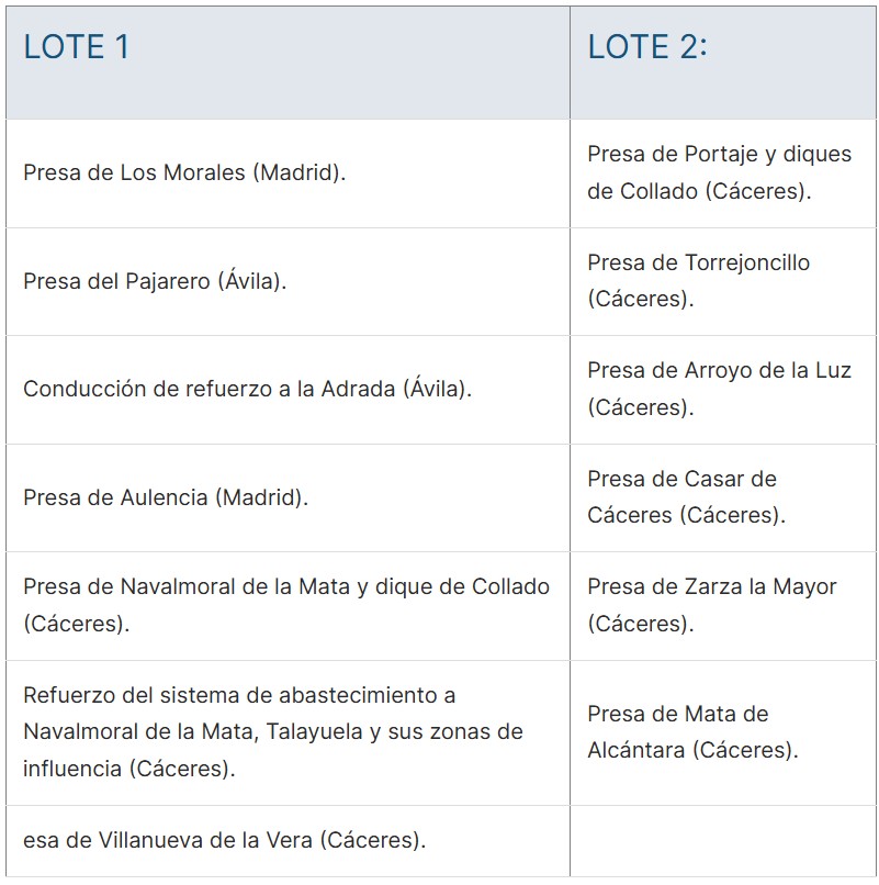 Esta licitación consta de dos lotes que incluyen las siguientes presas de la cuenca del Tajo y una serie de actuaciones encaminadas a mantener y reforzar su seguridad: