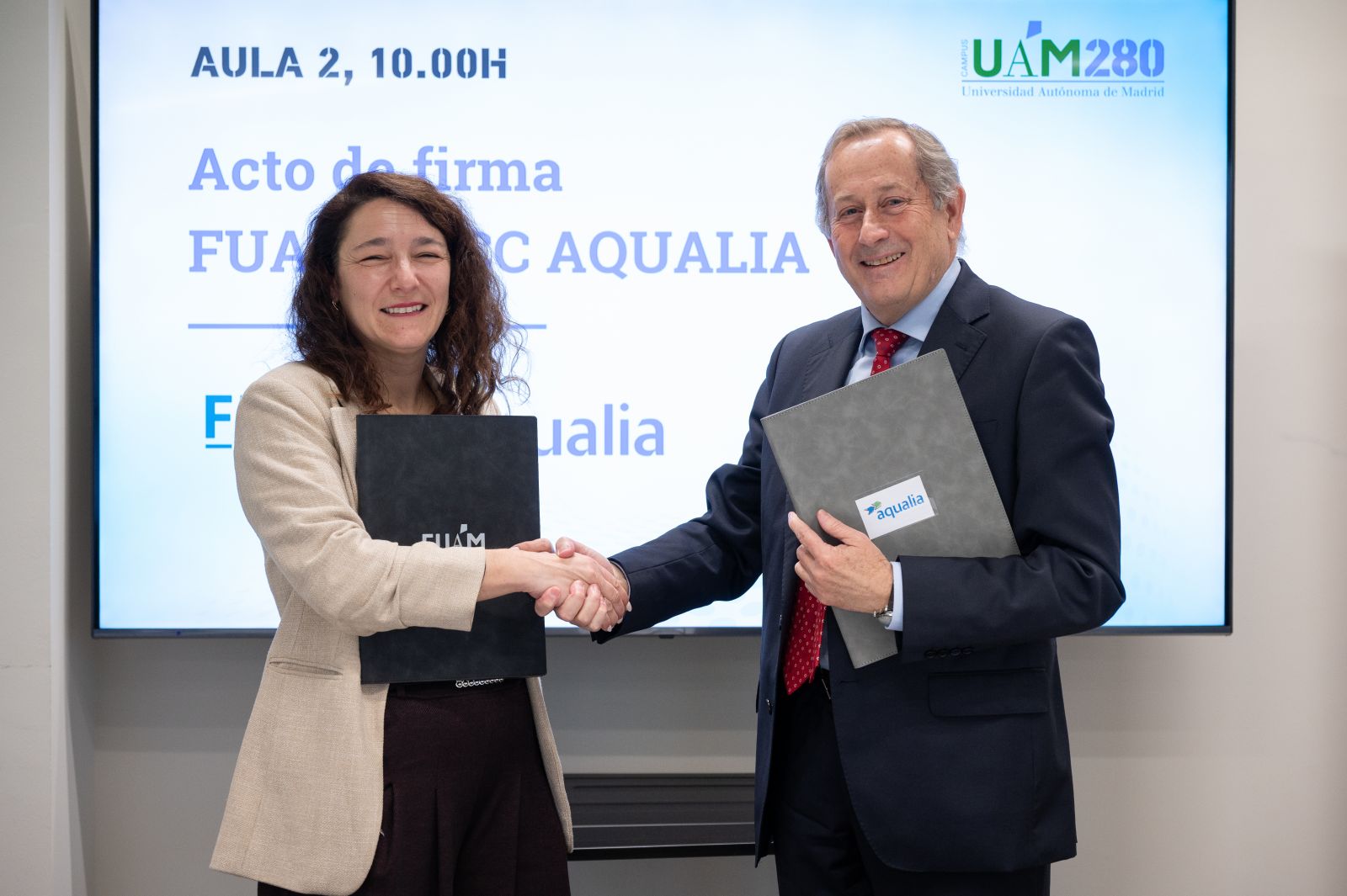 El acto de firma del convenio tuvo lugar en Campus UAM 280 de la Universidad Autónoma de Madrid, donde se reunieron representantes académicos y profesionales. Por parte de Aqualia asistieron Pedro Rodríguez Medina, director de Sostenibilidad e Innovación; Víctor Monsalvo García, responsable del Área de Ecoeficiencia; y María Reinoso Rodríguez, responsable del Área de Gestión. En representación de la Universidad Autónoma de Madrid y de la FUAM participaron Rocío Schettini, directora general de la Fundación UAM y José Francisco Palomar Herrero, catedrático del Departamento de Ingeniería Química de la Facultad de Ciencias.