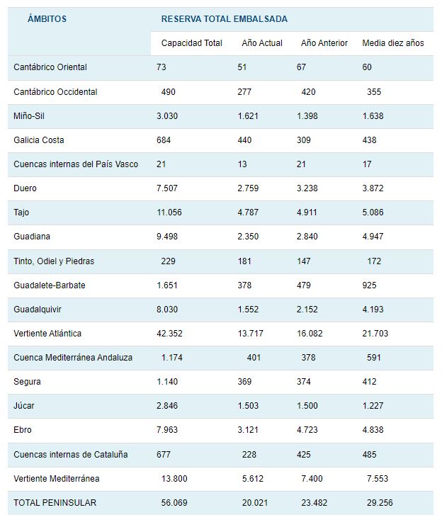 La reserva hídrica española está al 35,7 por ciento de su capacidad total. Los embalses almacenan actualmente 20.021 hectómetros cúbicos (hm³) de agua, aumentando en la última semana en 765 hm³ (una variación del 1,4 por ciento de la capacidad total actual de los embalses).