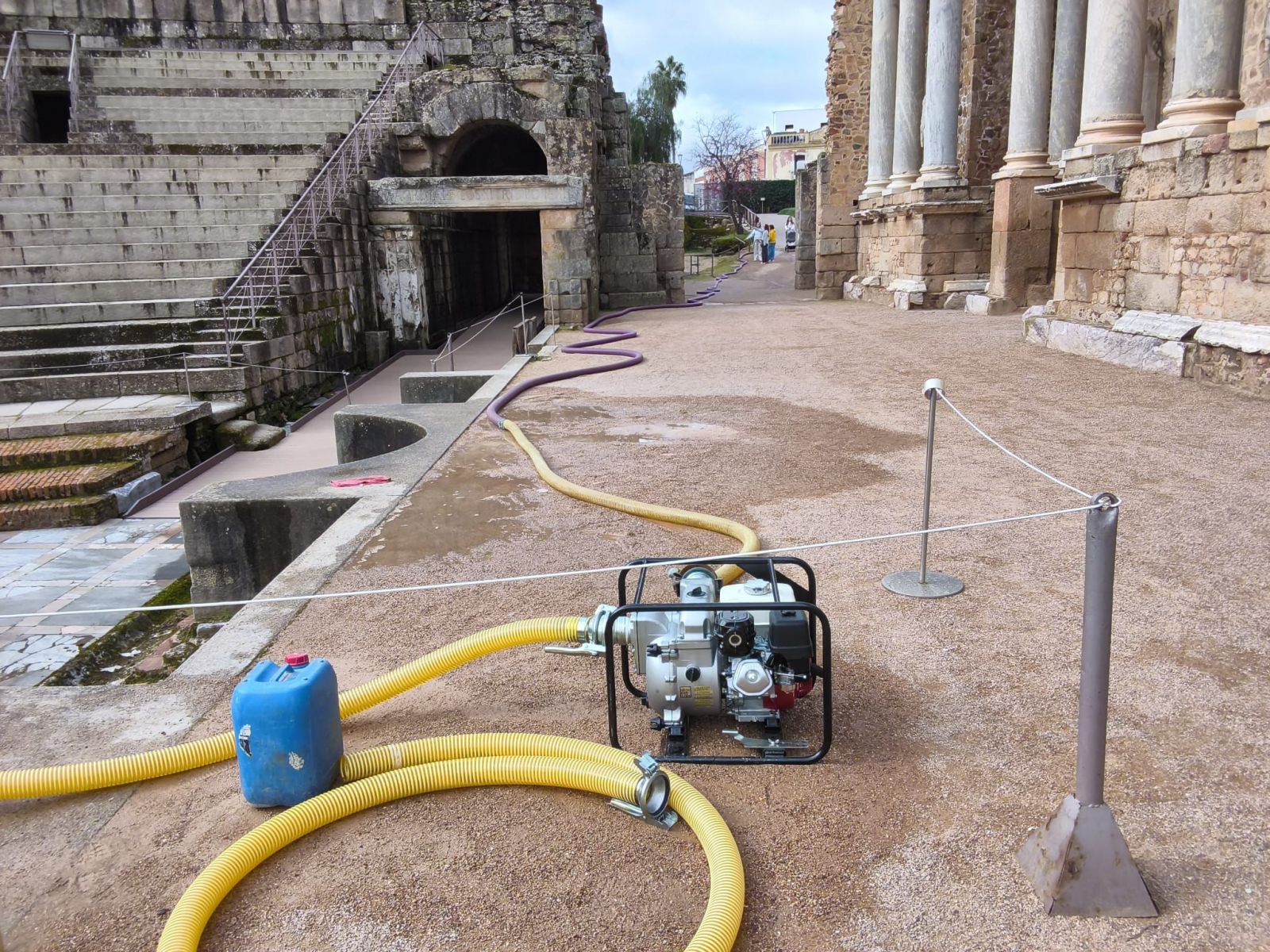 Los trabajos, coordinados con el Consorcio de la Ciudad Monumental de Mérida, han consistido en la extracción controlada del agua acumulada mediante equipos de bombeo de última generación y conducciones temporales específicamente diseñadas para operar en entornos delicados.