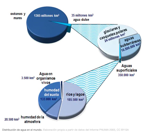 • Solo el 1 % corresponde a las aguas superficiales: ríos y lagos (53 %), humedad de la atmósfera (8 %), humedad del suelo (38 %) y agua presente en los organismos vivos (1 %).