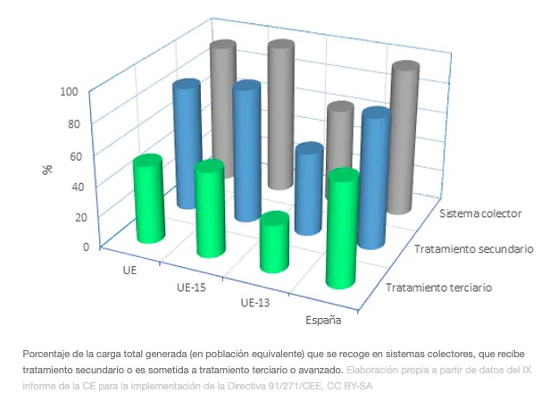 Nuestro país recoge de forma adecuada el 97 % de la carga contaminante de aguas residuales generada (61,8 millones h-e). El 84,1 % se somete a tratamiento secundario y el 66,8 % a tratamiento terciario o avanzado. Aun así, no se ha logrado el 100 % de cumplimiento de la normativa.