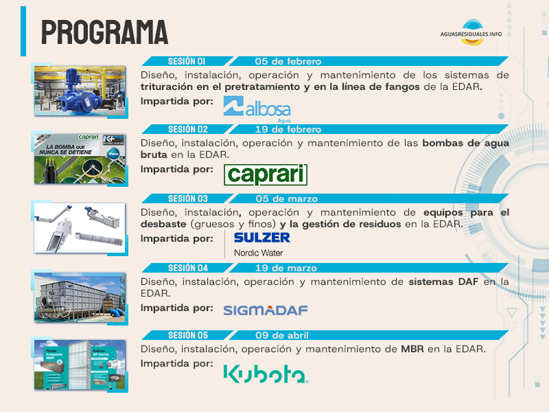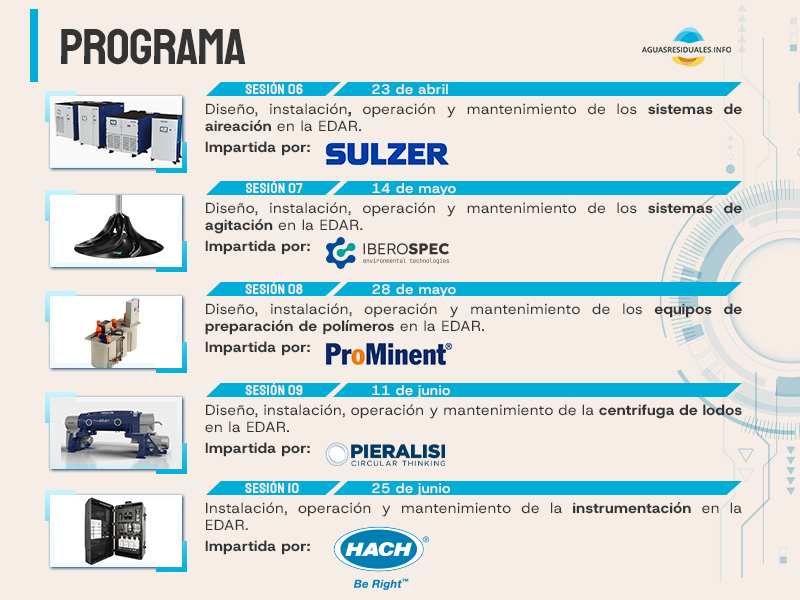 Cada sesión estará dedicada a un tipo de equipo, siguiendo de forma cronológica la línea de agua de una EDAR, ofreciendo a los profesionales inscritos formarse y conocer con más detalle desde el diseño, la instalación, la operación y el mantenimiento de estas soluciones críticas para el proceso de nuestras plantas.