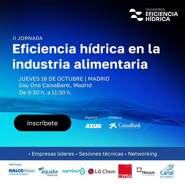 La gestión eficiente del agua se ha consolidado como uno de los grandes desafíos para la industria alimentaria. Con el objetivo de compartir soluciones prácticas, experiencias reales y avances normativos, AZUD, en colaboración con CaixaBank, celebra el 16 de octubre en la sala de eventos Day One CaixaBank de Madrid la II Jornada de Eficiencia Hídrica en la Industria Alimentaria, un encuentro que se desarrolla exclusivamente de forma presencial y reúne a expertos, empresas líderes y representantes institucionales del sector.