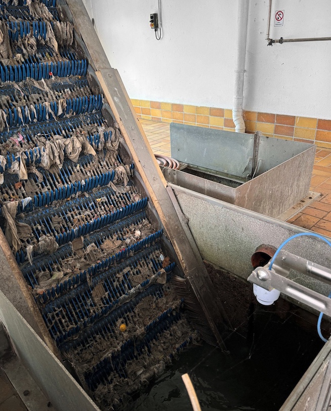 La rejilla de cribado fino se encarga de eliminar los sólidos más pequeños. Los sensores radar miden el nivel del agua delante y detrás de las rejillas.